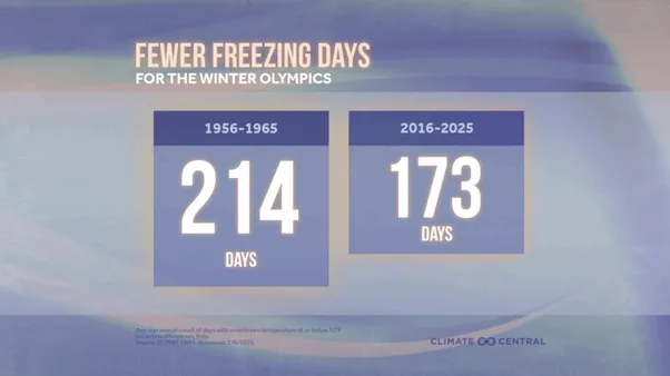 Rising temperatures have significantly reduced the number of freezing days. In the decade following the 1956 Games, Cortina recorded an average of 214 days per year below freezing. Between 2016 and 2025, that figure dropped to 173 days — a decline of 41 days, or nearly 19 percent.